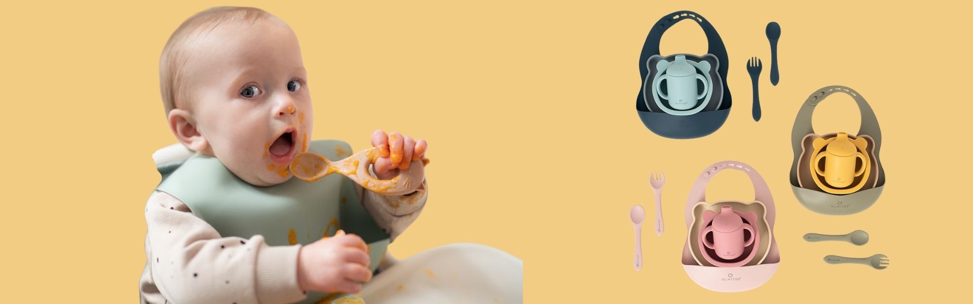 Vajilla de silicona de tres piezas para cuando el bebé comienza con la alimentación complementaria. Ideal tanto para triturados como para la práctica de Baby Led Weaning.