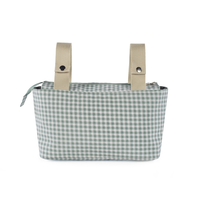Incorpora asas cortas con las que puedes fijarla a cualquier modelo de silla de paseo y asa larga para que te la puedas colgar en el hombro.