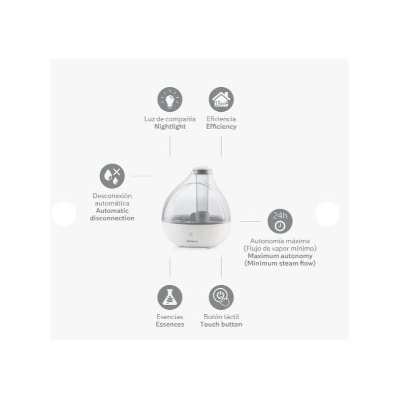 El compartimento para esencias de este humidificador permite utilizar todo tipo de esencias del mercado.Humidificador de vapor frío de gran autonomíaCon gran autonomía de funcionamiento, superior a 12 horas con flujo de vapor máximo incluso con su reducido tamaño. Capacidad del depósito de 1.5 litros. Ideal para habitaciones de hasta 15m2.