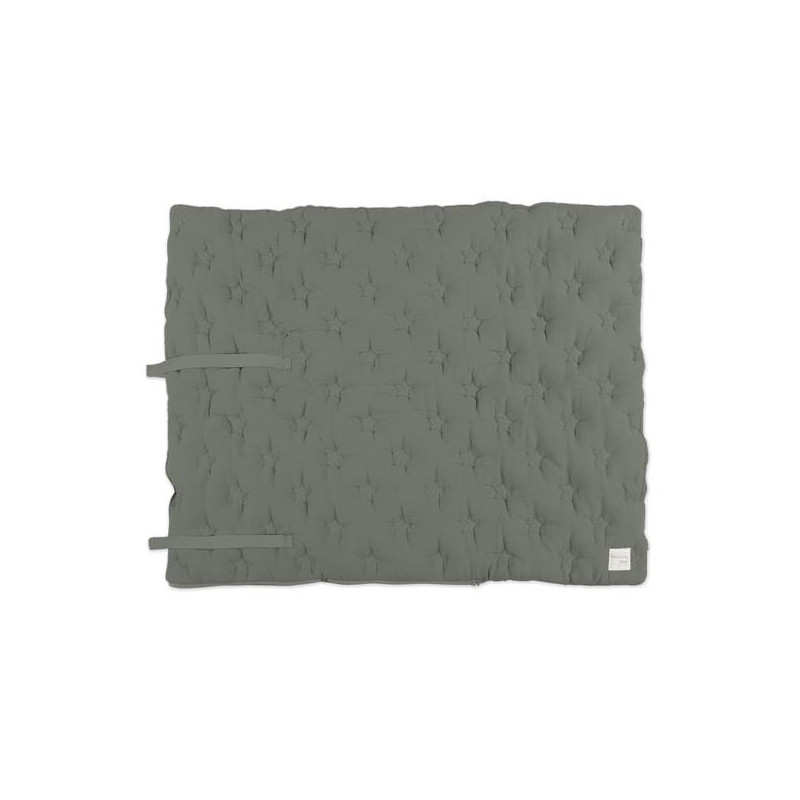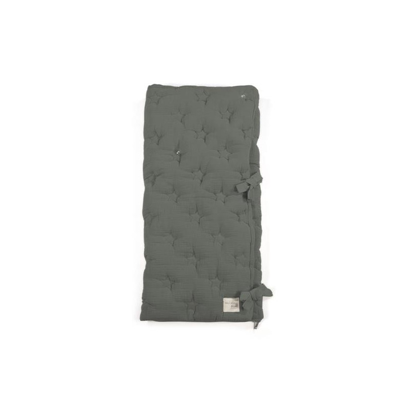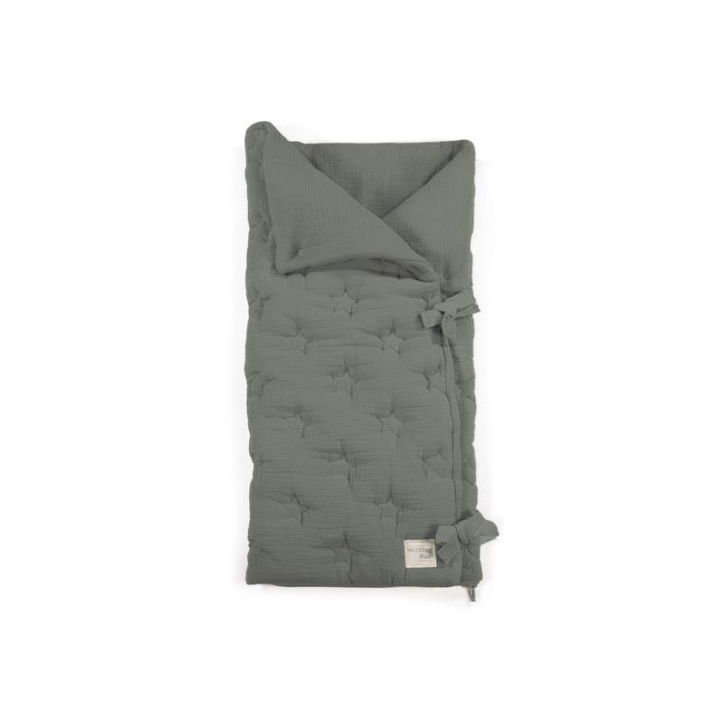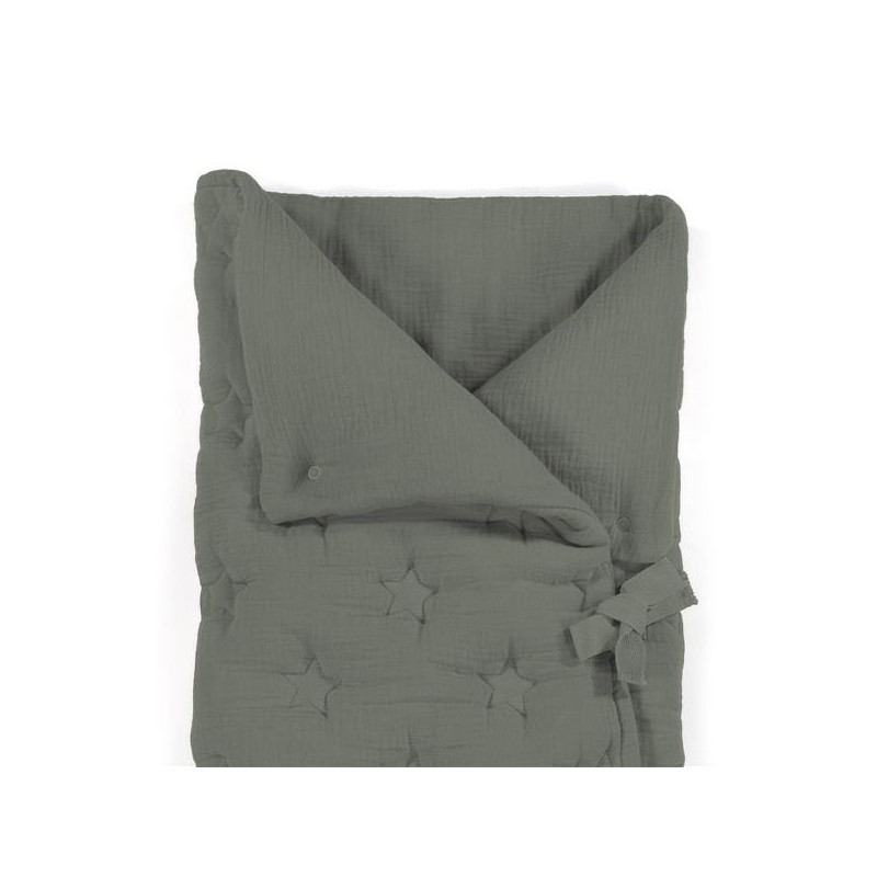 Saco arrullo o saco manta Caetana Stone con estrellas bordadas verde. Está fabricado con una suave muselina 100% algodón. Ideal para los primeros dias del bebé. Es perfecto para los primeros paseos en el capazo.