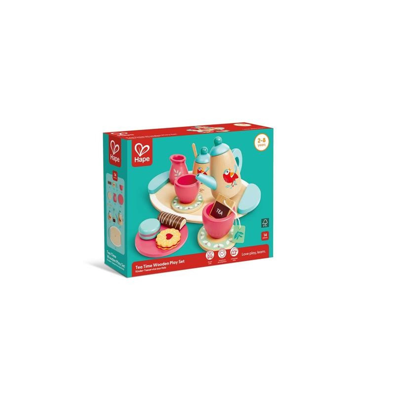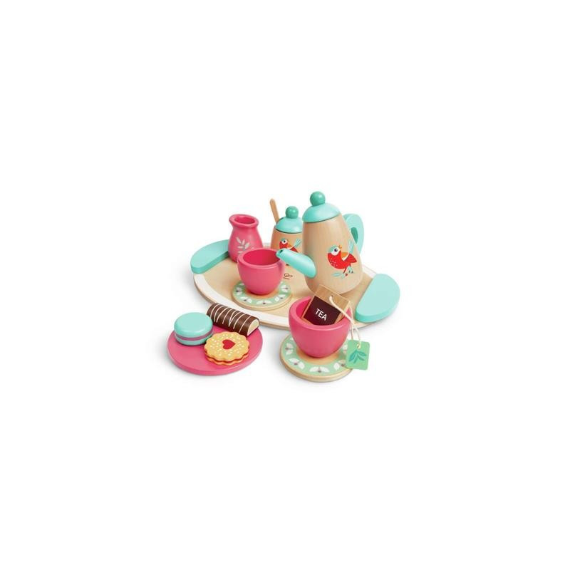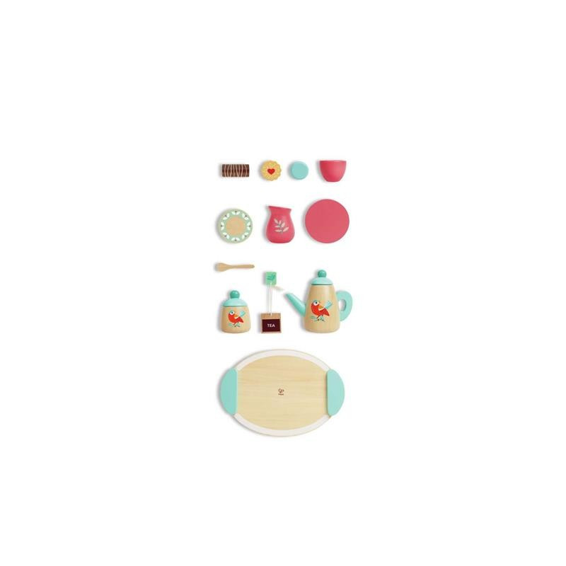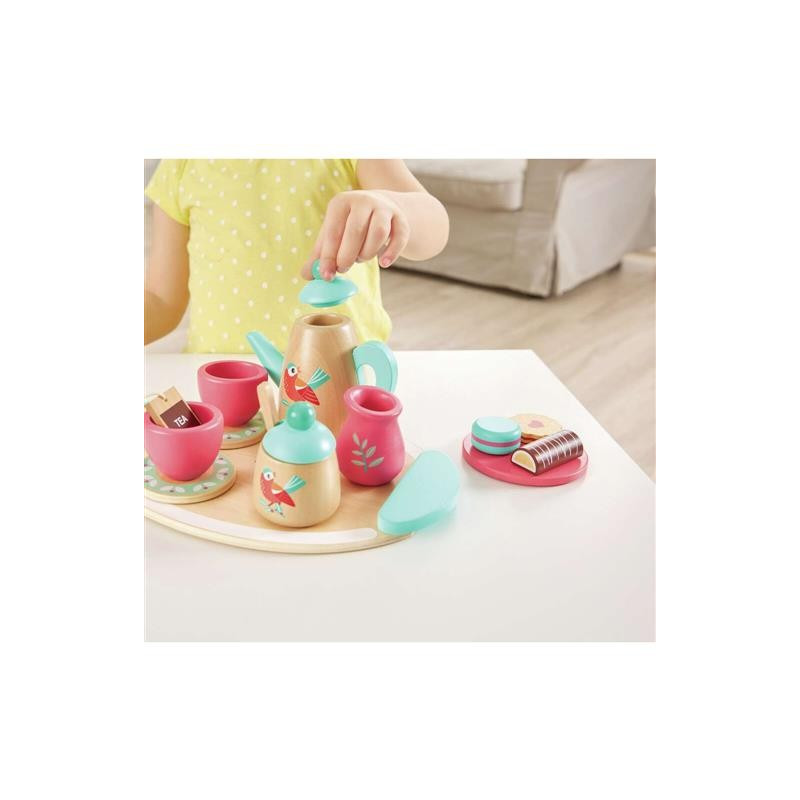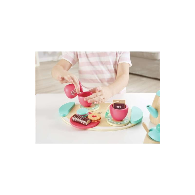 Con este elegante juego de té de madera, tu hijo podrá montar su propia fiesta del té para disfrutar con sus amigos humanos o de peluche.