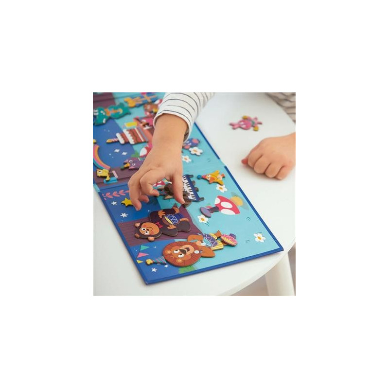 ¡Ven, corre! Acaba de caer la noche en el bosque y hay una gran sorpresa. Un mundo fantástico espera a los niños a partir de 3 años con este juego magnético. Consta de un decorado ilustrado y 30 imanes. Esos imanes se han diseñado con el fin de desarrollar la motricidad fina del niño. Así podrá agarrar cada uno de ellos para colocarlo en el decorado y contar un montón de historias salidas de su imaginación.