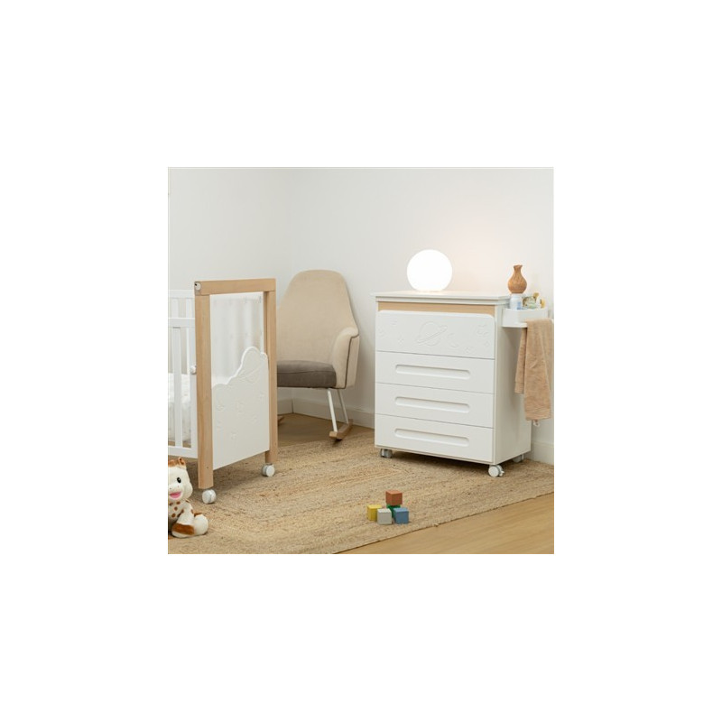 Esta bañera cuenta con cubeta, jabonera y desagüe para bañar al bebé de una manera cómoda. En la parte superior, incorpora un práctico cambiador y las ruedas facilitan el traslado del mueble.