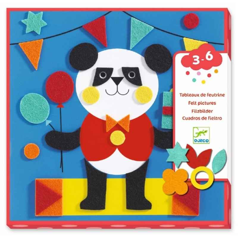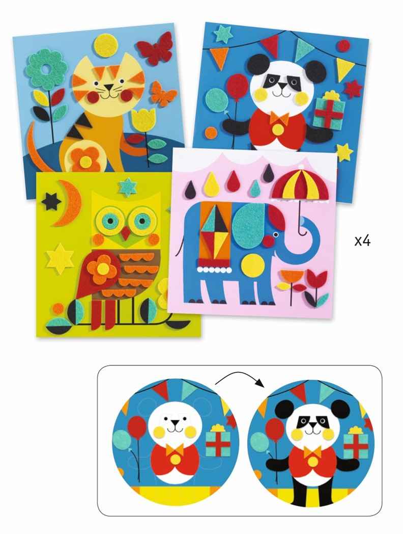 Descubre una divertida actividad creativa para los más pequeños: Un collage con pegatinas de fieltro blando para crear 4 cuadros con adorables animales. Incluye 4 cartones ilustrados, 111 pegatinas de fieltro gruesas y fáciles de manipular, y un folleto explicativo en imágenes, sin texto, que guía paso a paso el montaje de cada dibujo.
