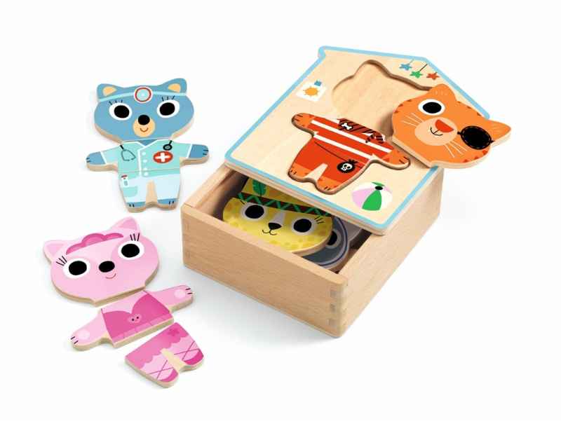 ¡Diversión, mezcla y aprendizaje desde los 2 años! El puzle de madera Dressup Mix permite a los más pequeños crear y combinar 6 coloridos personajes, cada uno formado por 3 piezas. ¿Eligen vestir a la bailarina, al doctor o al pirata? ¿O prefieren mezclar las piezas y crear nuevos personajes imaginarios?