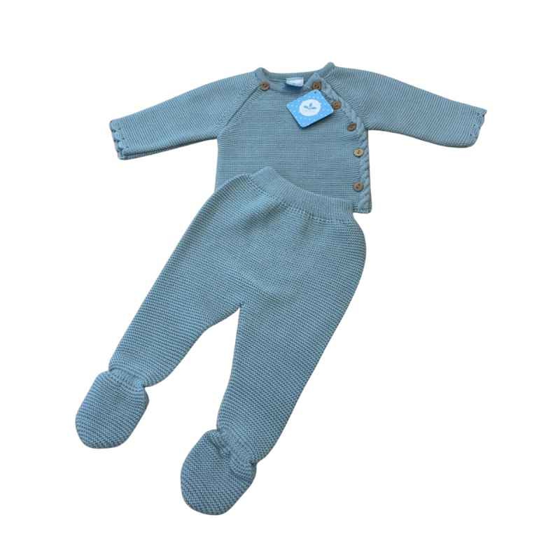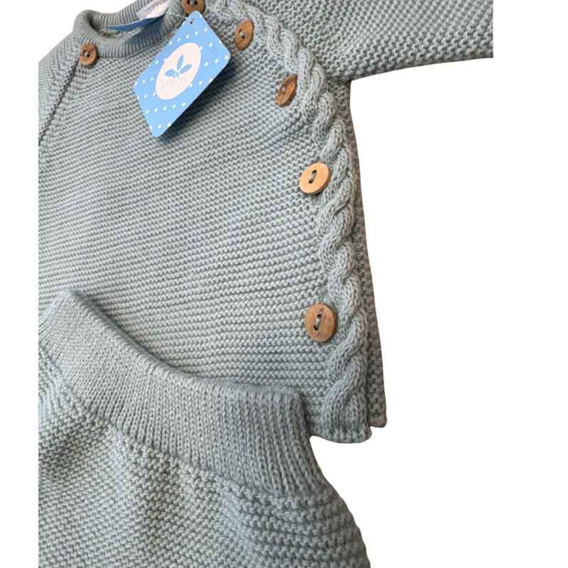 Conjunto de punto para bebé en color verde, compuesto por jersey con botones de madera en lateral y polaina con pies, cómodo y elegante para el día a día.