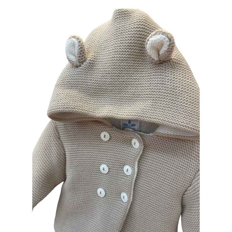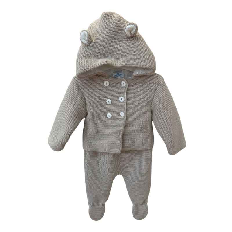 Tierno conjunto de punto que incluye chaqueta con capucha y orejitas, y polaina a juego.