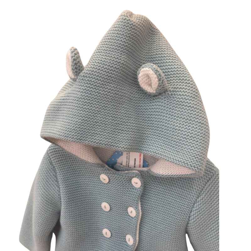 Tierno conjunto de punto que incluye chaqueta con capucha y orejitas, y polaina a juego.