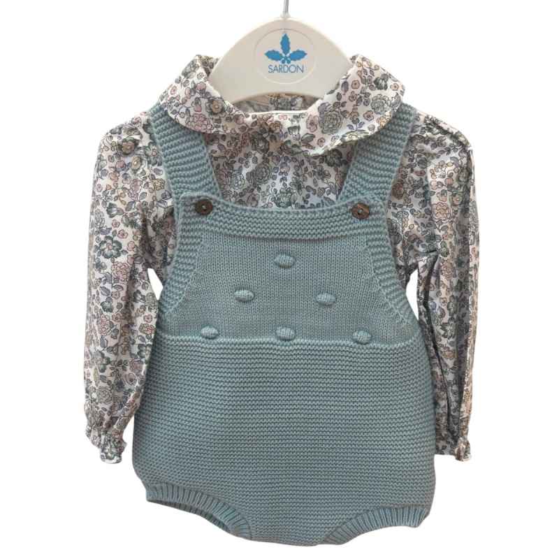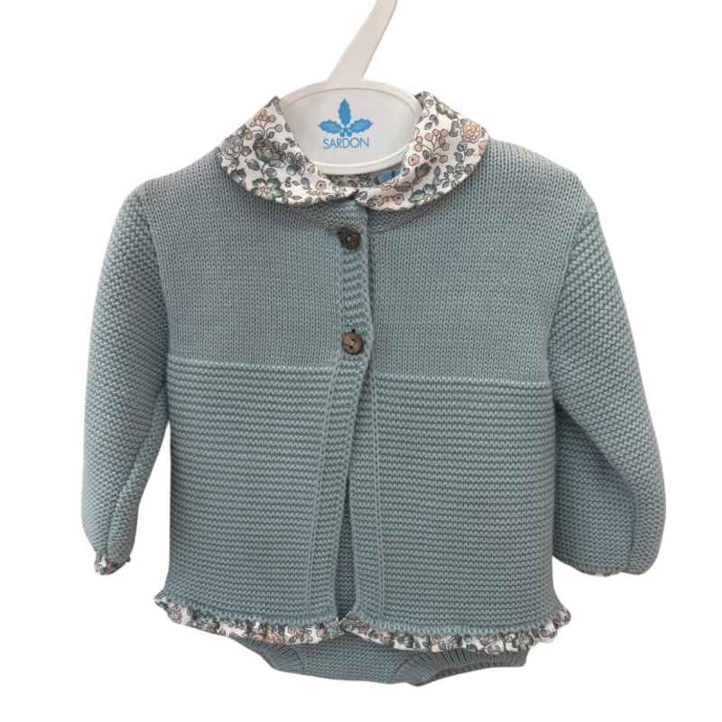 Encantador conjunto de punto en color verde agua, compuesto por pelele, chaqueta y blusa con cuello floral a juego.