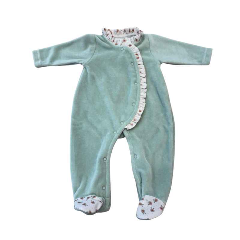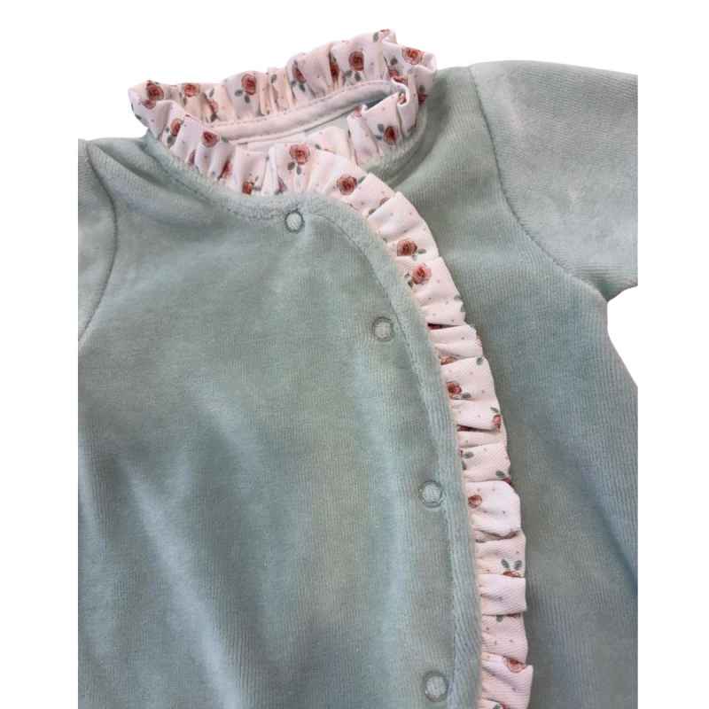 Este adorable pijama enterizo para bebé en un suave tono verde menta es la opción perfecta para mantener a tu pequeño cómodo y cálido durante todo el día o la noche. Confeccionado en tela aterciopelada.