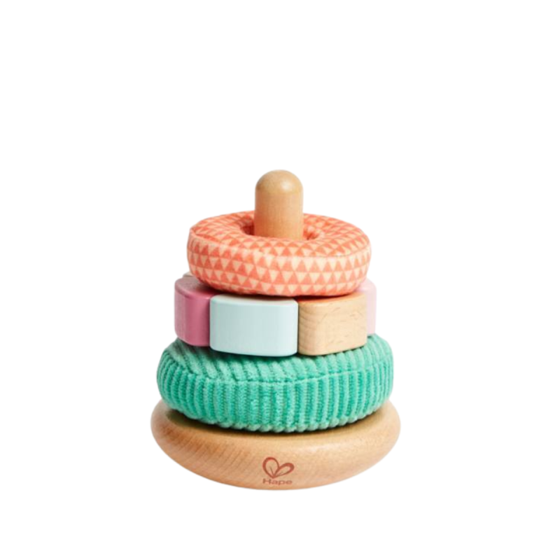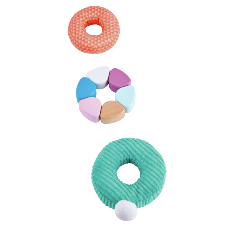 -Los tres anillos para apilar consisten en: - Un anillo azul claro con tela de pana suave y una cola blandita con pompón. Al tirar de la cola se escuchan suaves y alegres sonidos. - Un anillo en forma de flor con seis pétalos de diferentes colores hechos con madera de haya sostenible, enlazados por una banda elástica y duradera, y que se pueden mover. - Un anillo de tela rosa que también se puede utilizar como sonajero.