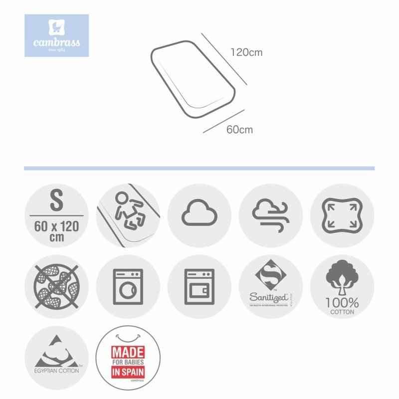 La sábana ajustable para cuna de 60 cm de Cambrass actúa como una práctica bajera gracias a su goma elástica, que se adapta perfectamente al colchón por los laterales. Está confeccionada en algodón egipcio 100% y cuenta con tratamiento Sanitized, que garantiza una higiene óptima al proporcionar protección antimicrobiana duradera, evitando la proliferación de bacterias, hongos y malos olores.