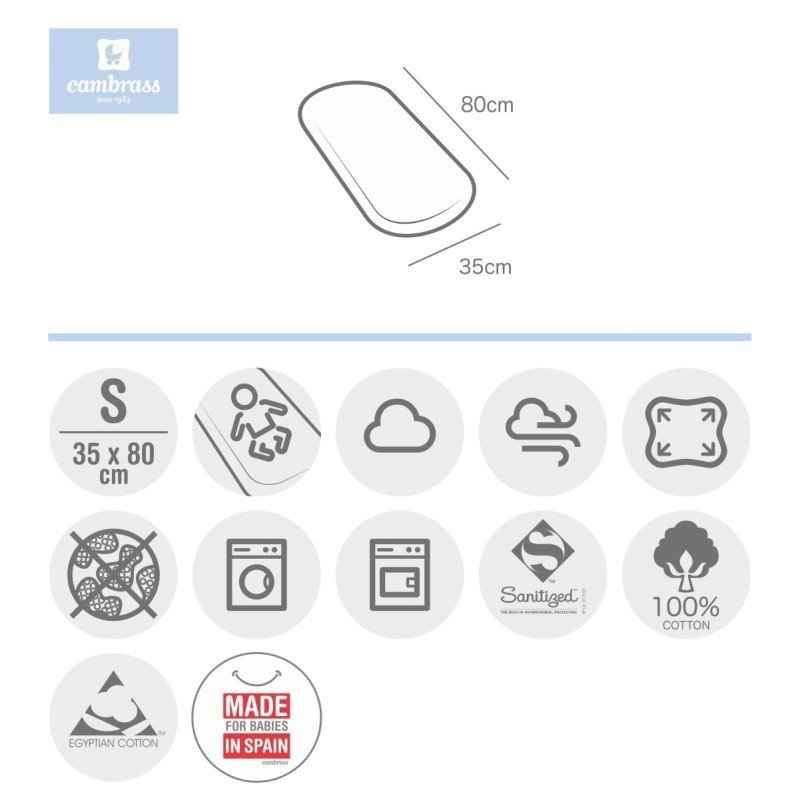 La sábana ajustable para cochecito o moisés de Cambrass funciona como una práctica bajera. Fabricado en España. Por Cambrass
