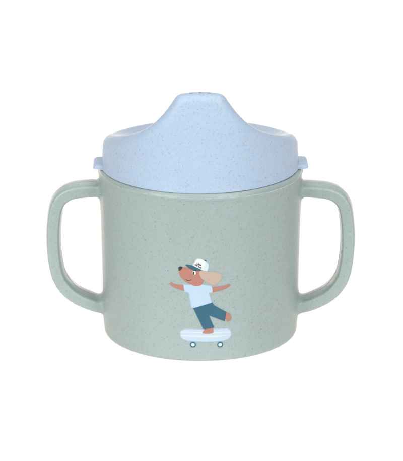 Vaso de aprendizaje para bebés a partir de los 6 meses de edad, con dos asas para cogerlo con facilidad y tapa con dosificador para evitar derrames y que se moje. Fabricado con celulosa libre de BPA.