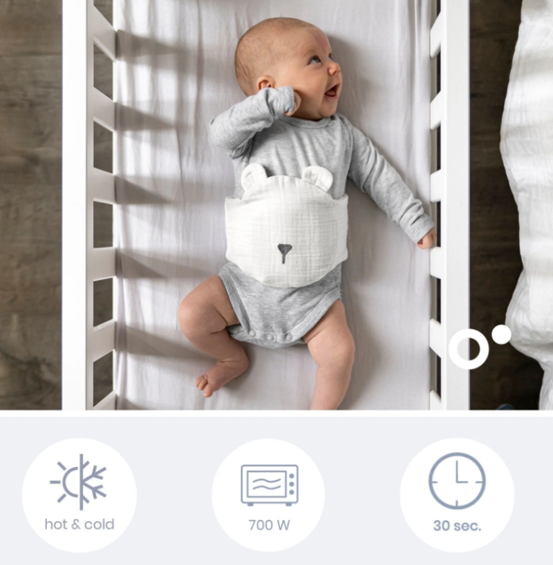Bolsa térmica para cólicos del bebé con cinturón ajustable, diseñada para aliviar el dolor abdominal del lactante de forma natural. Se calienta en solo 45 segundos en el microondas y también puede usarse en frío.