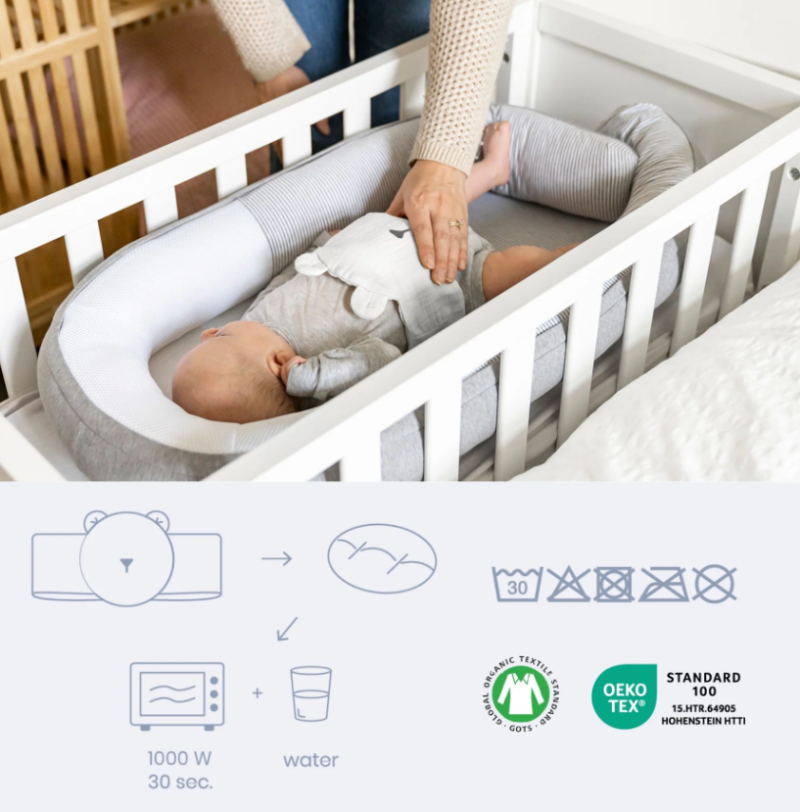 Pensada para el bienestar y la seguridad del bebé, esta bolsa térmica cuenta con certificación Oeko-Tex y GOTS, garantizando materiales seguros, ecológicos y libres de sustancias nocivas. Además, su funda es lavable a máquina a 30 °C, lo que facilita su mantenimiento y la hace perfecta para el uso diario.