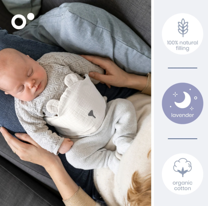El cinturón está confeccionado con gasa de algodón orgánico 100%, suave y respetuosa con la piel delicada del bebé. En su interior contiene semillas vegetales y lavanda, un relleno natural que ayuda a distribuir el calor de forma uniforme y aporta una sensación relajante.