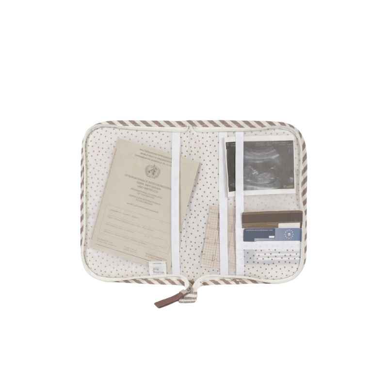 El libro de nacimiento Praliné Rayas Moka es una funcional carpeta portadocumentos de diseño a juego con la bolsa de maternidad. Un complemento indispensable para llevar contigo a todas partes que te ayudará a tener ordenada toda la documentación y papeles médicos de tu bebé (vacunas, recetas, partida de nacimiento).