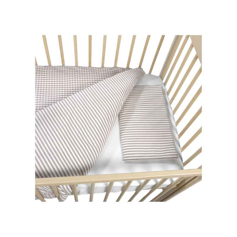 El cubre cuco con vuelta y sábana bajera ajustable Botton con estampado de rayas es el complemento perfecto para aportar suavidad y elegancia al capazo de tu bebé. Fabricado en algodón 100%, garantiza un tacto delicado y transpirable, ideal para la piel sensible del recién nacido. El cubre capazo con vuelta se ajusta perfectamente al capazo. Su diseño ajustable con gomas garantiza una perfecta adaptación al cuco proporcionando un acabado envolvente y seguro con un diseño encantador de estampado de rayas en tonos neutros. La sábana bajera ajustable, confeccionada en muselina de algodón 100%, ofrece una suavidad excepcional y transpirabilidad óptima, asegurando el confort del bebé en todo momento. Compatible con la mayoría de los capazos. Este conjunto es ideal para mantener a tu bebé cómodo y protegido.