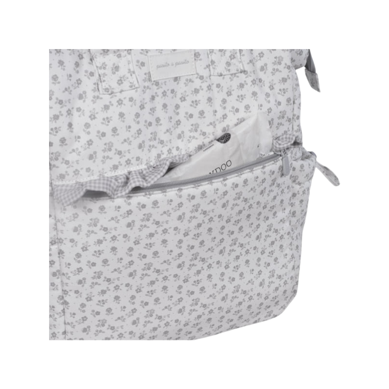 Descubre la mochila maternal Little Bloom Flor gris de Pasito a Pasito, confeccionada en loneta de algodón 100% con un delicado estampado de flores. Su tratamiento water resistant la hace resistente al agua, garantizando protección y durabilidad en el día a día. Esta mochila ofrece gran capacidad y múltiples compartimentos, facilitando la organización de todo lo necesario para el bebé.