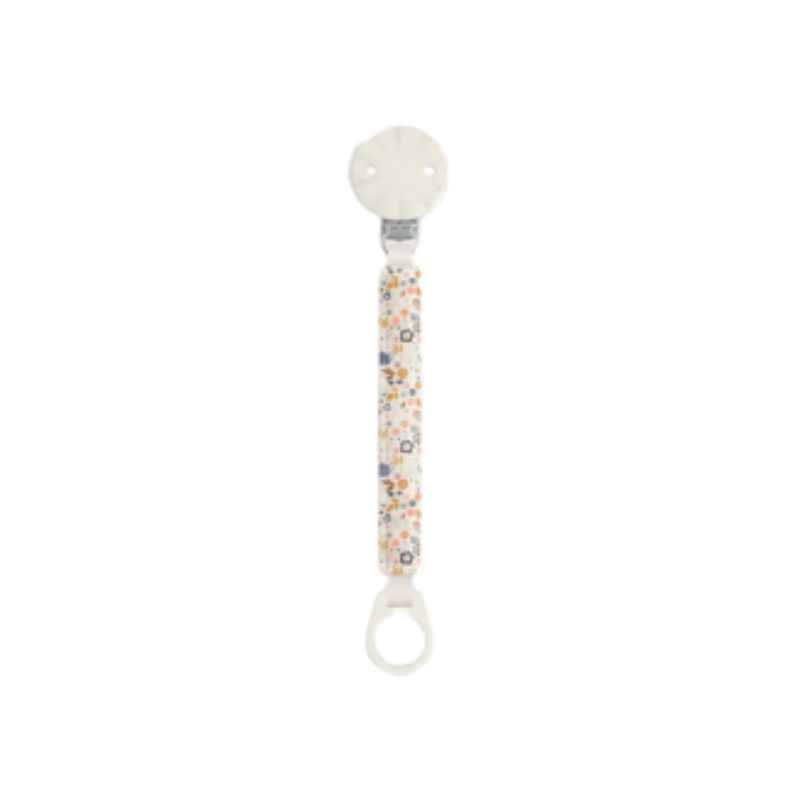 Esta cadena para chupetes permite sujetar los chupetes a la ropita del bebé, evitando así que caiga al suelo, se ensucie, o se pierda. La pinza del broche, que se sujeta a la ropa, lleva unida un aro de silicona en la que introducir el botón de los chupetes Wonder, de forma redonda, y Wonderland, con forma de mariposa. Chupetero con placa en forma redonda, el complemento ideal para el chupete.