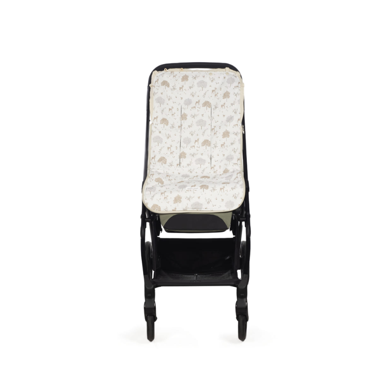 Viene con ojales para sacar los arneses de la silla. La parte trasera de la colchoneta tiene malla 3D para que sea más fresquita y evitar la sudoración del bebé.