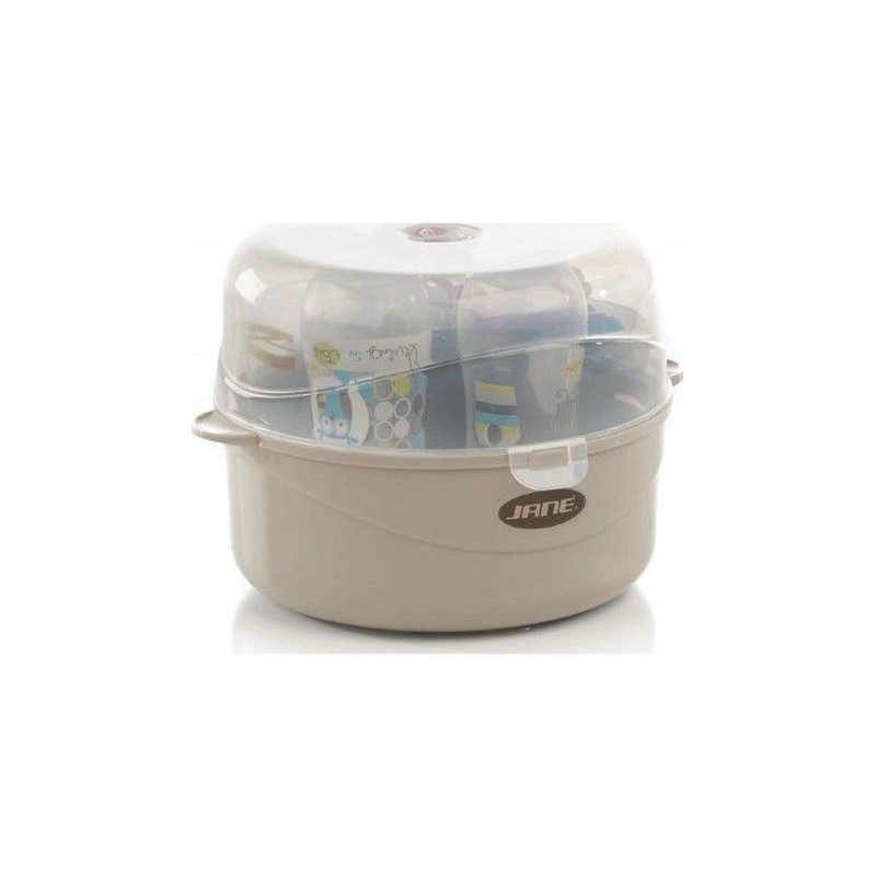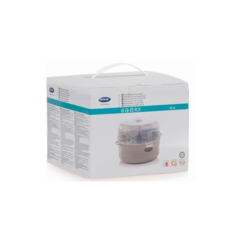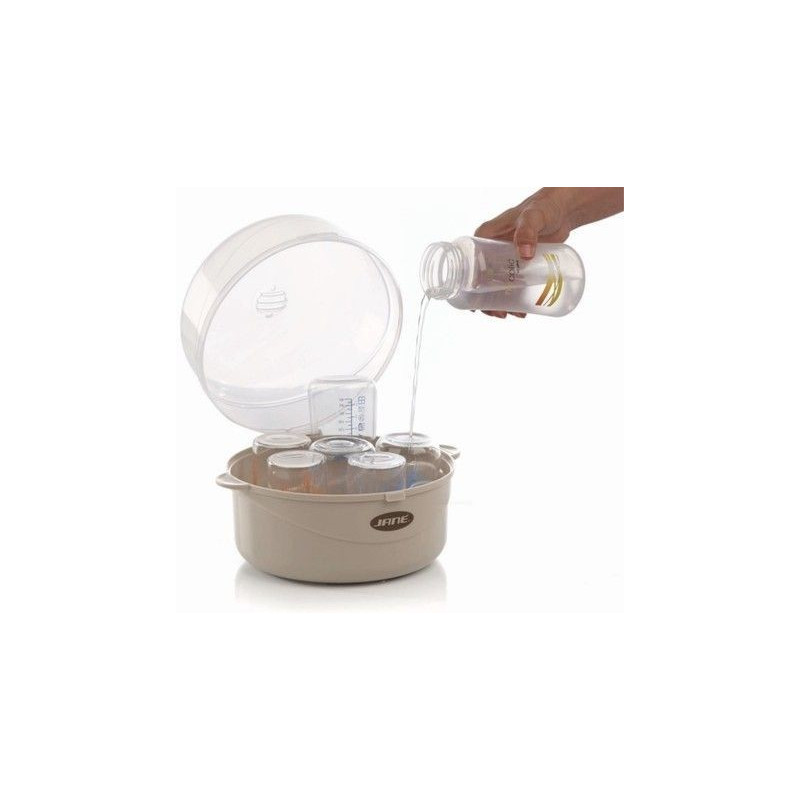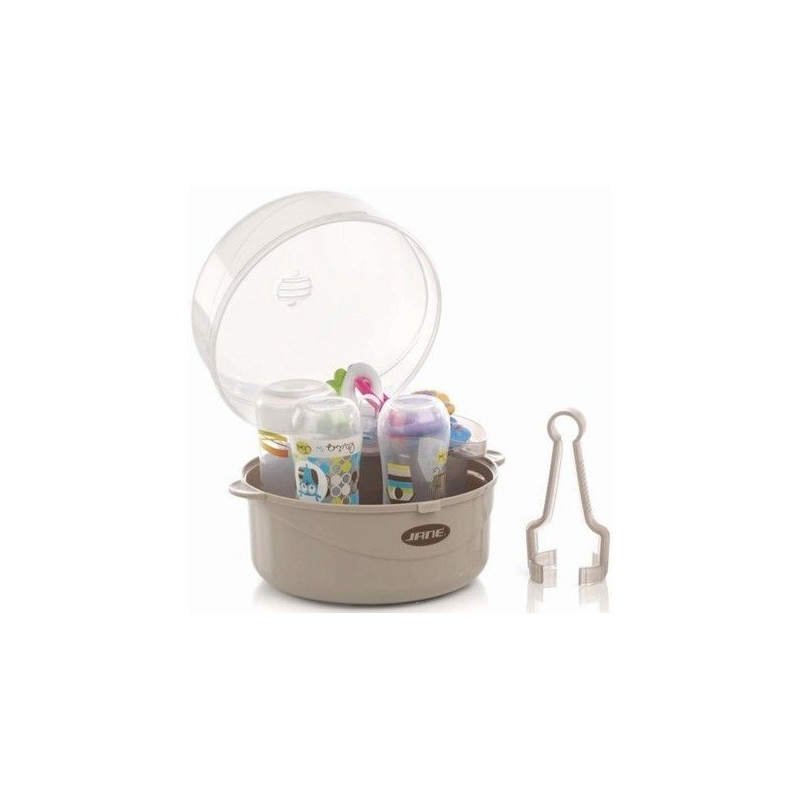 Con el esterilizador microondas Jané, se puede esterilizar las botellas sin productos químicos. Se puede esterilizar hasta 6 botellas. Además, se proporciona una cesta especial para tetinas y accesorios, junto con unas pinzas.