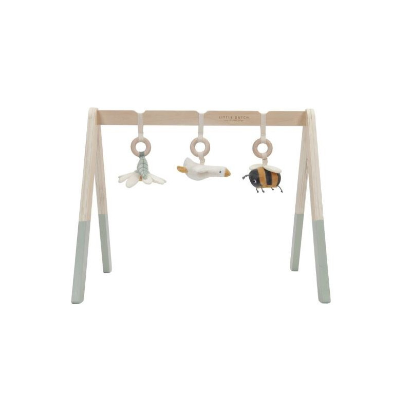 Este gimnasio para bebés está hecho de resistente madera e incluye tres peluches de diferentes texturas para tocar y sentir.